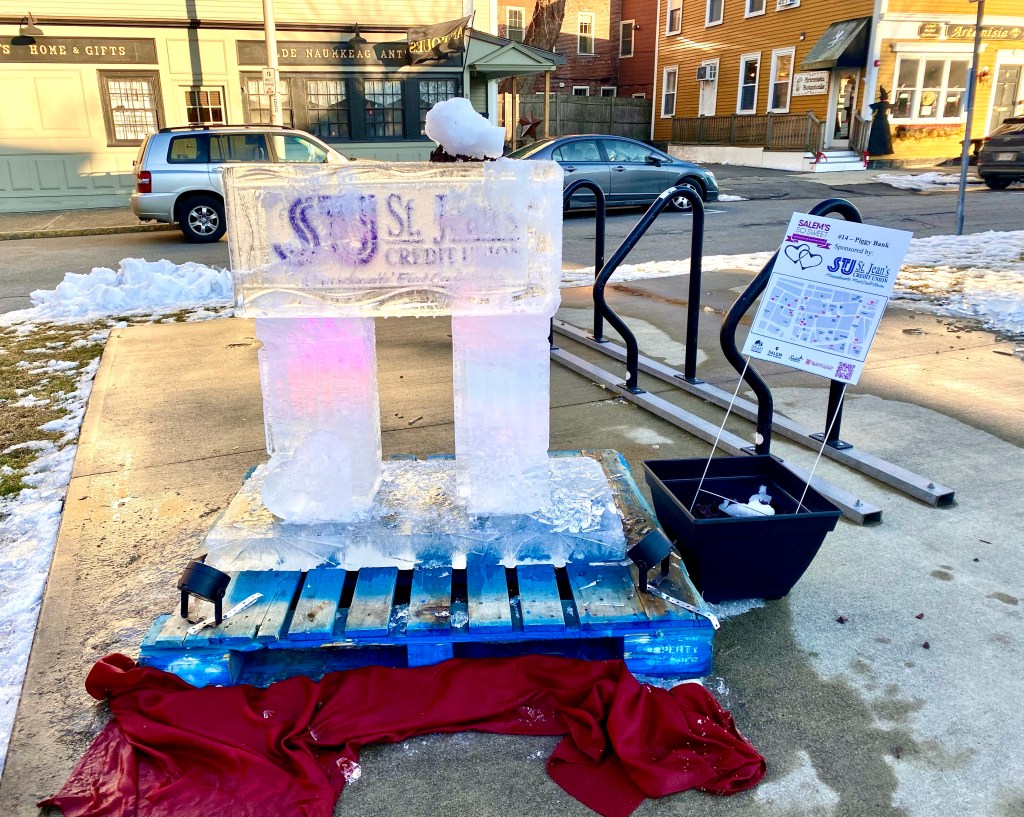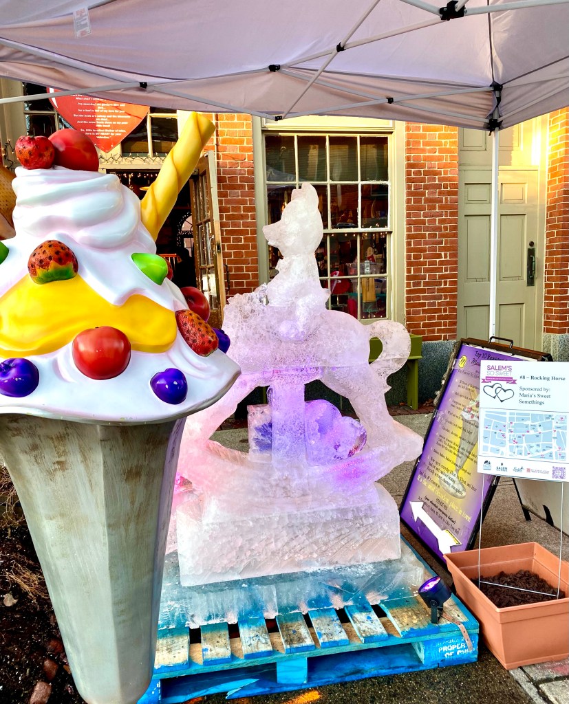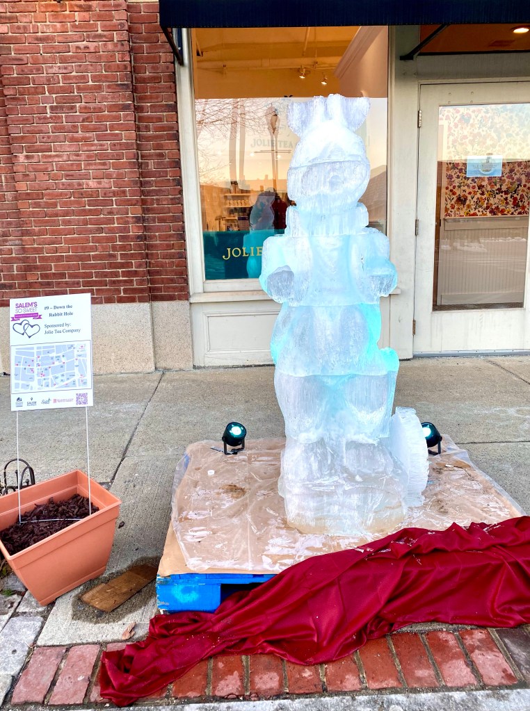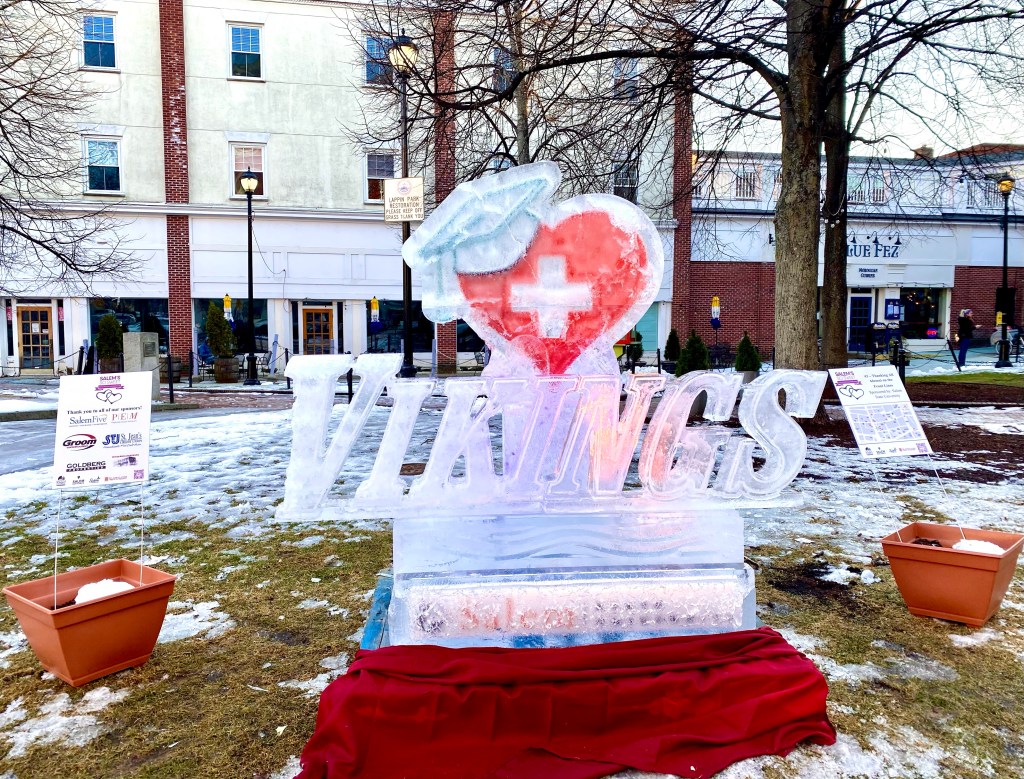 Ice sculptures, by Ice Effects, were installed on Saturday, February 6th and will stay up through Saturday, February 14th, as long as the weather permits. I would advise, if you are even thinking about viewing the works of art, to do so as soon as possible. A few of the sculptures have already had some delicate parts broken off, such as, the word ‘Vikings’ in 3. Thanking All Alumni on the Front Lines, sponsored by Salem State University, the rabbits limbs in 9. Down the Rabbit Hole, sponsored by Jolie Tea Company, and the horse’s head in 8. Rocking Horse, sponsored by Maria’s Sweet Somethings.